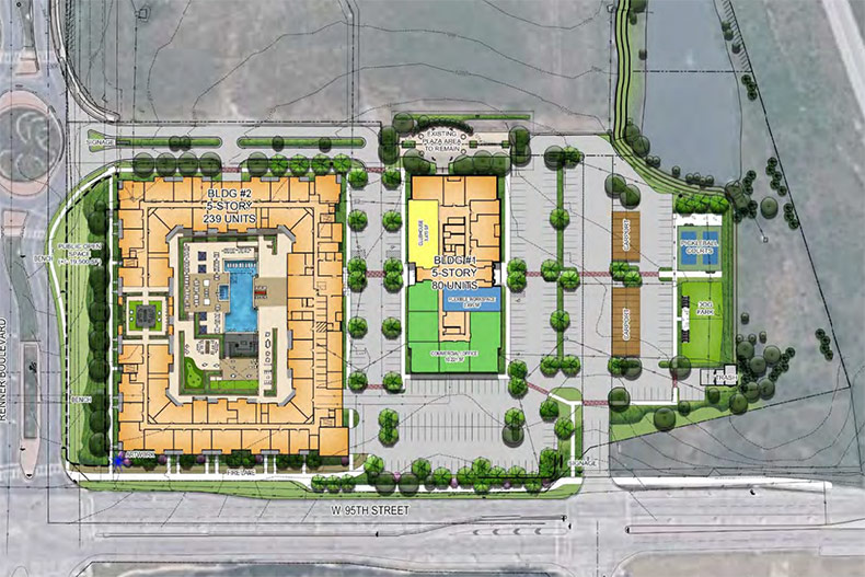 - The development would potentially have pickleball courts and a dog park on its eastern edge and would also have access to the 95th Street bike and pedestrian trail leading from Old Town Lenexa to the Shawnee Mission Park streamway.