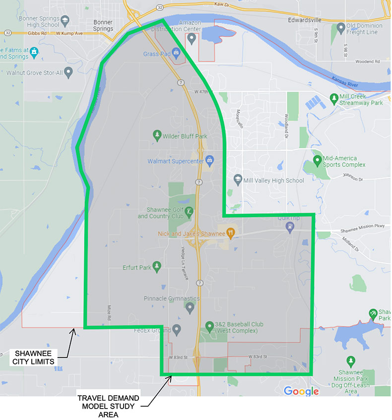 A proposed traffic study would look at traffic patterns along the K-7 corridor from the city’s northern border along the Kansas River, south to about 83rd Street. Area above outlined in green denotes the traffic study zone. Image via Shawnee city documents.