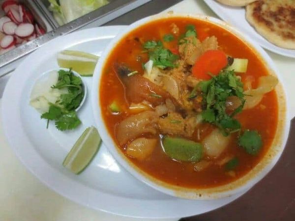 It serves pupusas de queso, a beef stew with potatoes called carne guisada, panes rellenos, tamales and cóctel de camarón.