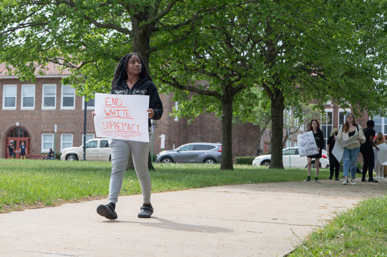 - Some signs held by students read “white shaming isn’t real, cry about it” and “respect my existence or expect resistance.”