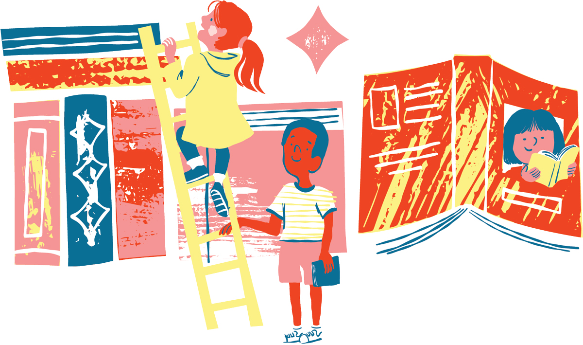 For the truck wrap (an excerpt of which is also the cover of this Guide), she has created exuberant images of a young girl reading a book with her mother and imagining a beautiful world, then writing her own words, then growing into a woman and sharing her book with her mother.