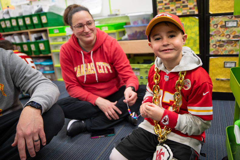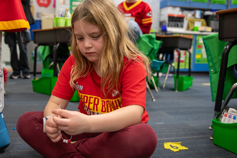 Emmit Moeller worked on friendship bracelets with his parents Bryan and Ann on Thursday morning at Heatherstone Elementary. He said he “likes how the Chiefs play so good.” Photo credit Kylie Graham.