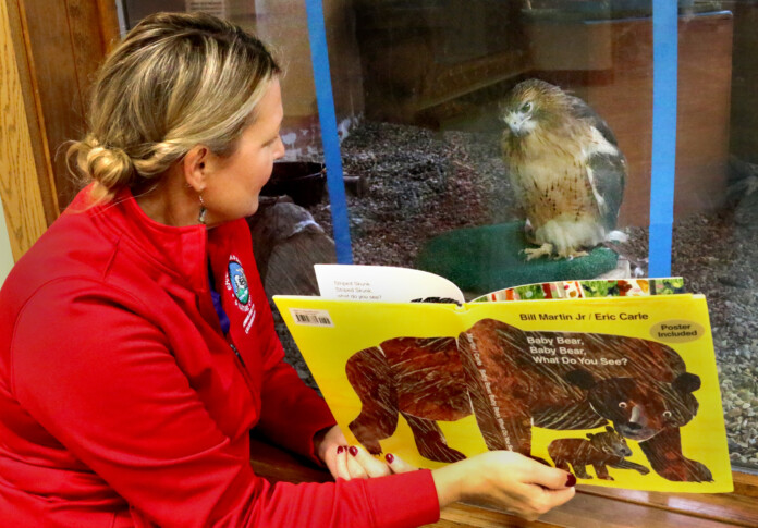 “Some of the enrichment activities include traveling around the area for educational programming, listening to music, watching videos or movies, reading books, singing to the animals, placing toys in the enclosure, making changes in their homes, new foods, etc.,” Grunewald said. “This is constantly changing as new ideas and research are exchanged at the nature center. Our youngest red-tailed hawk really enjoys looking at our bird calendar and “The Hungry Caterpillar” book.”