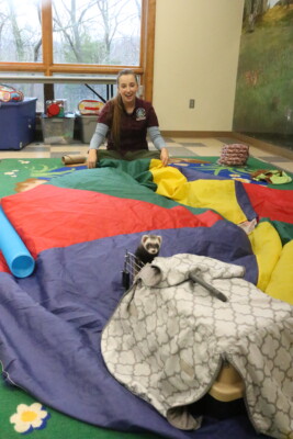 Next time you’re visiting the Ernie Miller Nature Center, don’t be surprised if you see a barn owl wildly bobbing its head up and down to a Shakira song. Or a red-tailed hawk intently looking at the colorful illustrations as a park naturalist reads to it from a kids’ storybook. Or a grey tree frog sitting on a bright red ball of the ball-pit variety. Or even a ferret happily romping around its own personal makeshift playground including a parachute and toys.