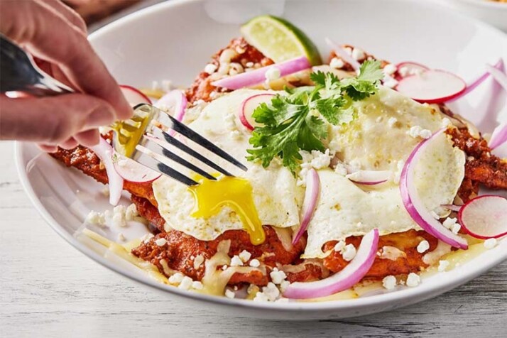 - The restaurant’s menu features a range of breakfast items, from chicken and waffles and cinnamon French toast to shrimp eggs Benedict and huevos rancheros.