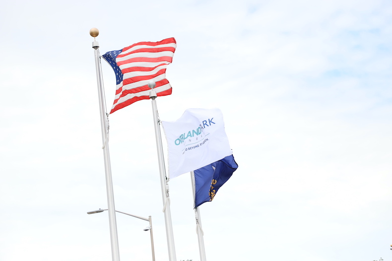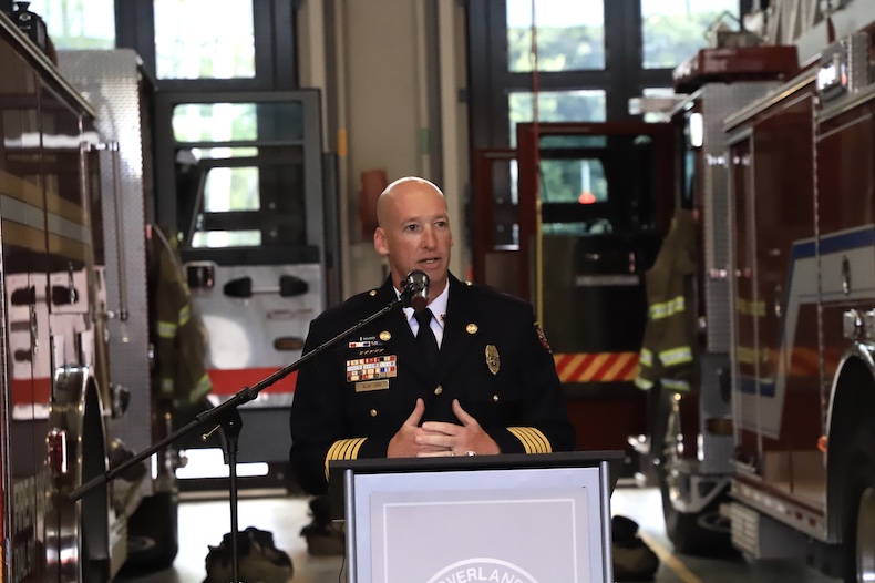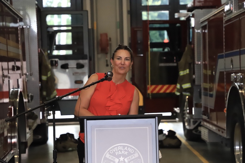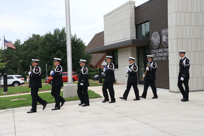 Overland Park’s new Firehouse No. 41 celebrated its reopening on Friday, June 28. Photo credit Kaylie McLaughlin.Overland Park Fire Chief Alan Long speaks from inside the vehicle bay at the Firehouse No. 41 rededication celebration. Photo credit Kaylie McLaughlin.Overland Park’s new Firehouse No. 41 is on the same site as the old firehouse, which is on land originally dedicated to the city by the Marty family. Photo credit Kaylie McLaughlin.City and community leaders marked the opening of the rebuilt Firehouse No. 41 in Overland Park with an “uncoupling” ceremony. Photo credit Kaylie McLaughlin.The Overland Park Fire Honor Guard during the Firehouse No. 41 rededication celebration on Friday, June 28. Photo credit Kaylie McLaughlin.Overland Park City Manager Lori Curtis Luther adds her comments at the Firehouse No. 41 rededication celebration. Photo credit Kaylie McLaughlin.The flags outside of Overland Park’s Firehouse No. 41 blow in the wind. Photo credit Kaylie McLaughlin.