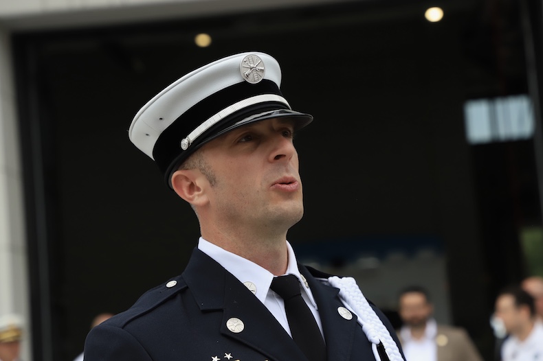 Overland Park Fire Department Honor Guard Coordinator DJ Hollandsworth at the Firehouse No. 41 rededication celebration on Friday. Photo credit Kaylie McLaughlin.