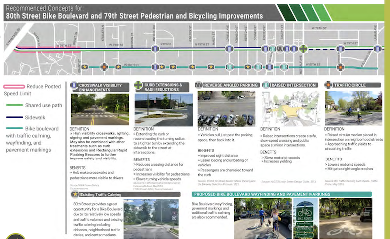 - One of the major ideas floated in the newly endorsed conceptual plan is a “bike boulevard” on 80th Street, which already has a lower speed limit and less vehicle traffic.