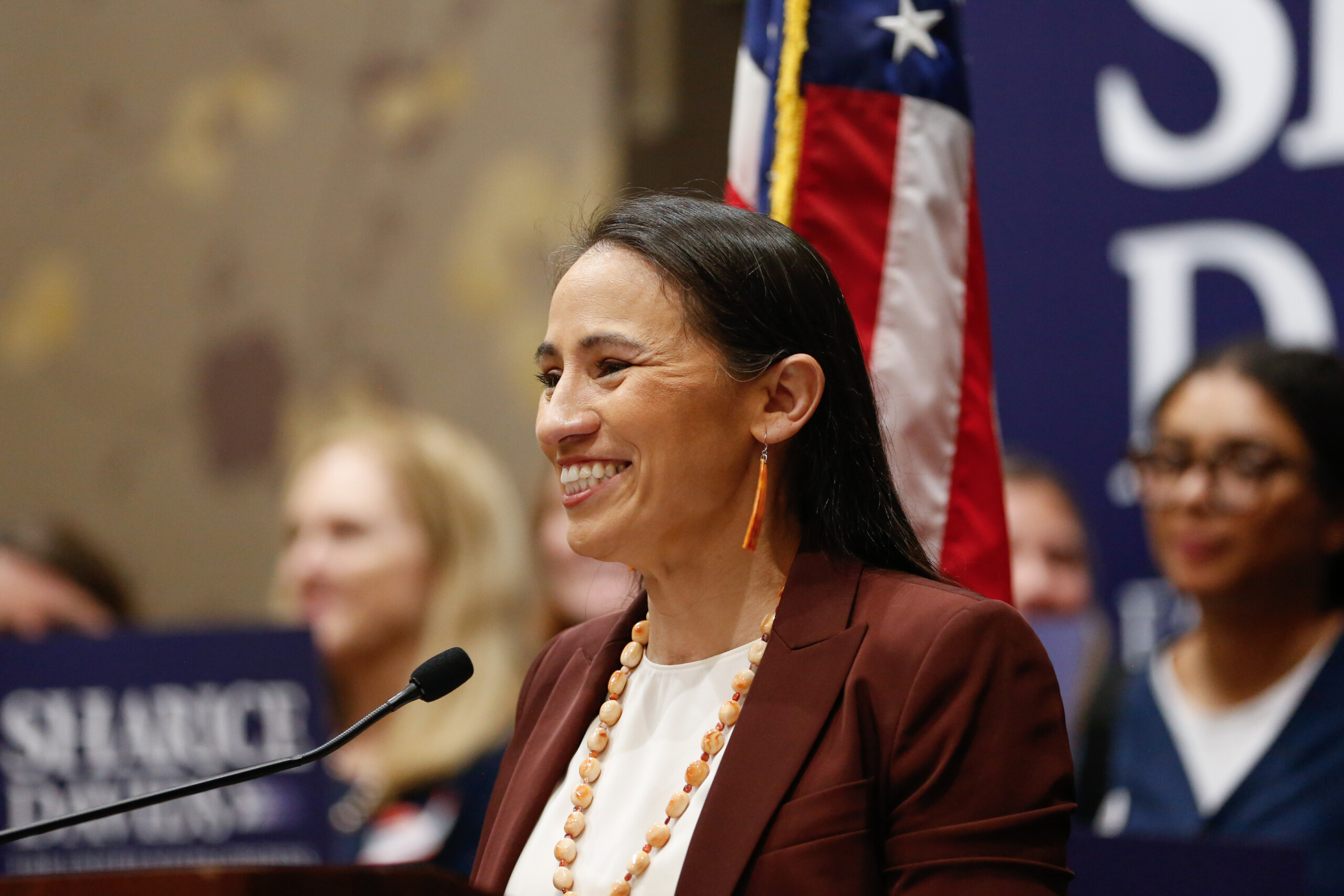 U.S. Rep. Sharice Davids addresses a Democratic Party gathering on Tuesday, Nov. 5. Photo credit Kylie Graham.