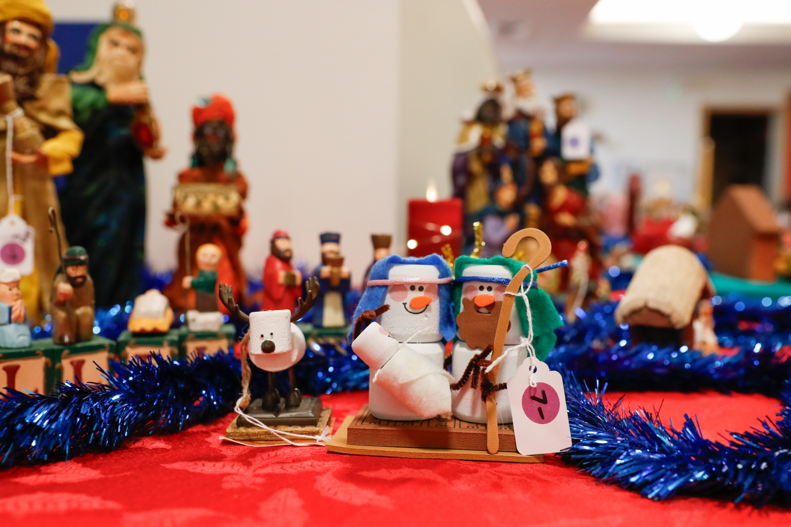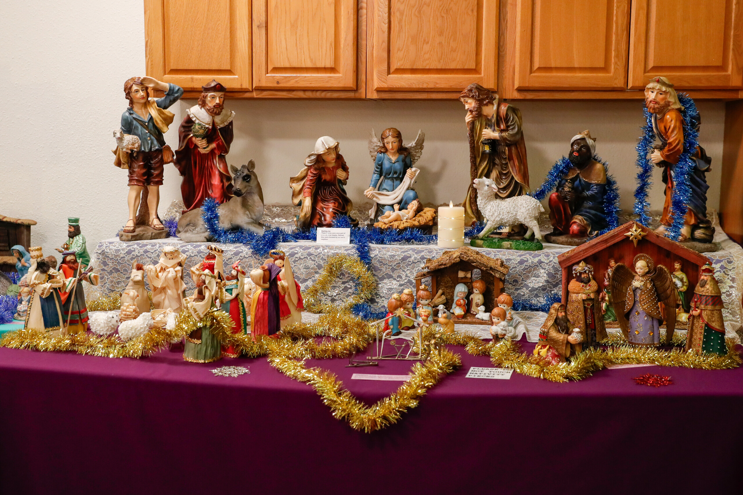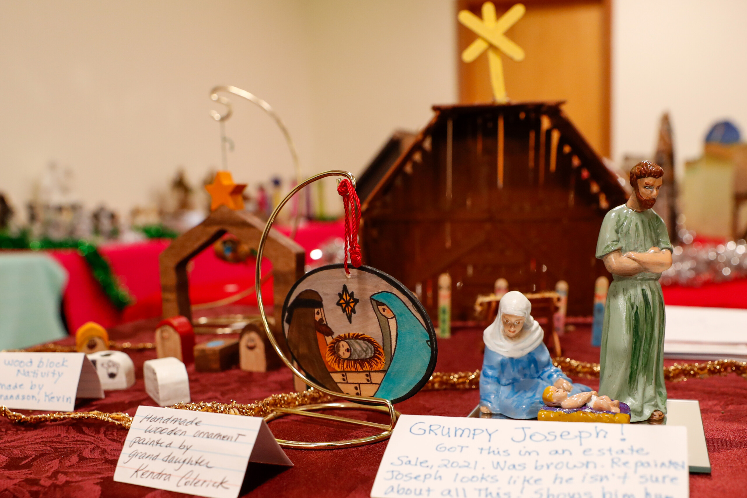 The first Nativity scene done by Rev. Margi Colerick’s mother in 1960. The bodies were made with Duron clay and baked in the family’s home oven. Many details were made from household items including a Wiseman gift from a shotgun shell and a paintbrush for Joseph’s staff. Photo credit Kylie Graham.A closeup of a one of the wise men made by 13-year-old Colerick using Duron clay and fabric. Colerick said she opted not to paint the wise men because she knew her painting skills would leave them looking like clowns. Photo credit Kylie Graham.All Nativity scenes placed on a red tablecloth are available for purchase with a limit of three per customer. The rest of Colerick’s 500-plus collection is available for a free viewing through Sunday. Photo credit Kylie Graham.This is Colerick’s and her daughter Rev. Robin Colerick-Shinkle’s favorite Nativity scene. “Robin and me think this is the best one because it’s very restful and peaceful with no people, just Jesus and the animals. It makes me feel calm and happy,” Margi said. Photo credit Kylie Graham.While she never kept an exact count of her collection, Colerick said that it was, at one point, well over 700. “There’s a little something for everyone here I think,” said Colerick. Photo credit Kylie Graham.A Nativity scene painted by Colerick’s grandaughter, to the left, next to another Nativity scene featuring a “Grumpy Joseph.” Colerick said she was drawn to “Grumpy Joseph” for how it portrays Mary’s husband in a more human way. Photo credit Kylie Graham.After seeing Facebook videos on Dollar Tree crafts, Colerick was inspired to create a more abstract Nativity scene using only what she could find in the store. Photo credit Kylie Graham.The display at Merriam Christian Church is free for all and open from 10 am to 6 pm on Saturday and noon to 6 pm on Sunday. Photo credit Kylie Graham.Scenes placed on red tables are for sale with prices marked down. “I want it to be so that you can buy something you’ll enjoy in your home, I’m not concerned with making money,” Colerick said. Sales benefit Merriam Christian Church’s outreach work in the community. Photo credit Kylie Graham.Many displays in Colerick’s exhibit take a twist on the classic Nativity scene, such as this one featuring chickens. Photo credit Kylie Graham.