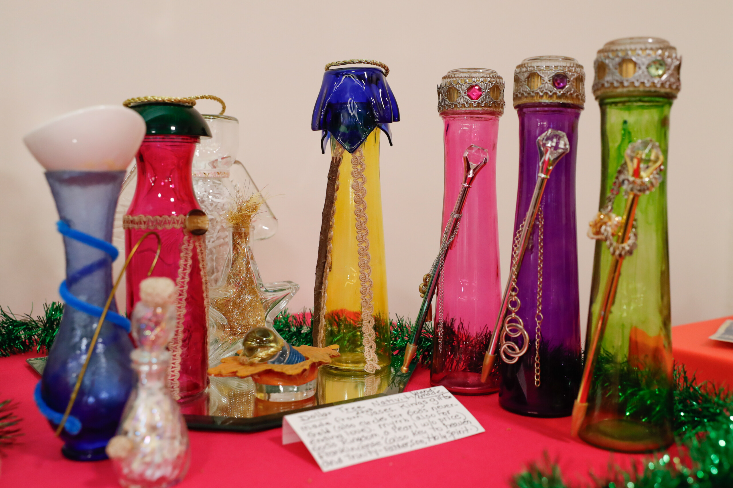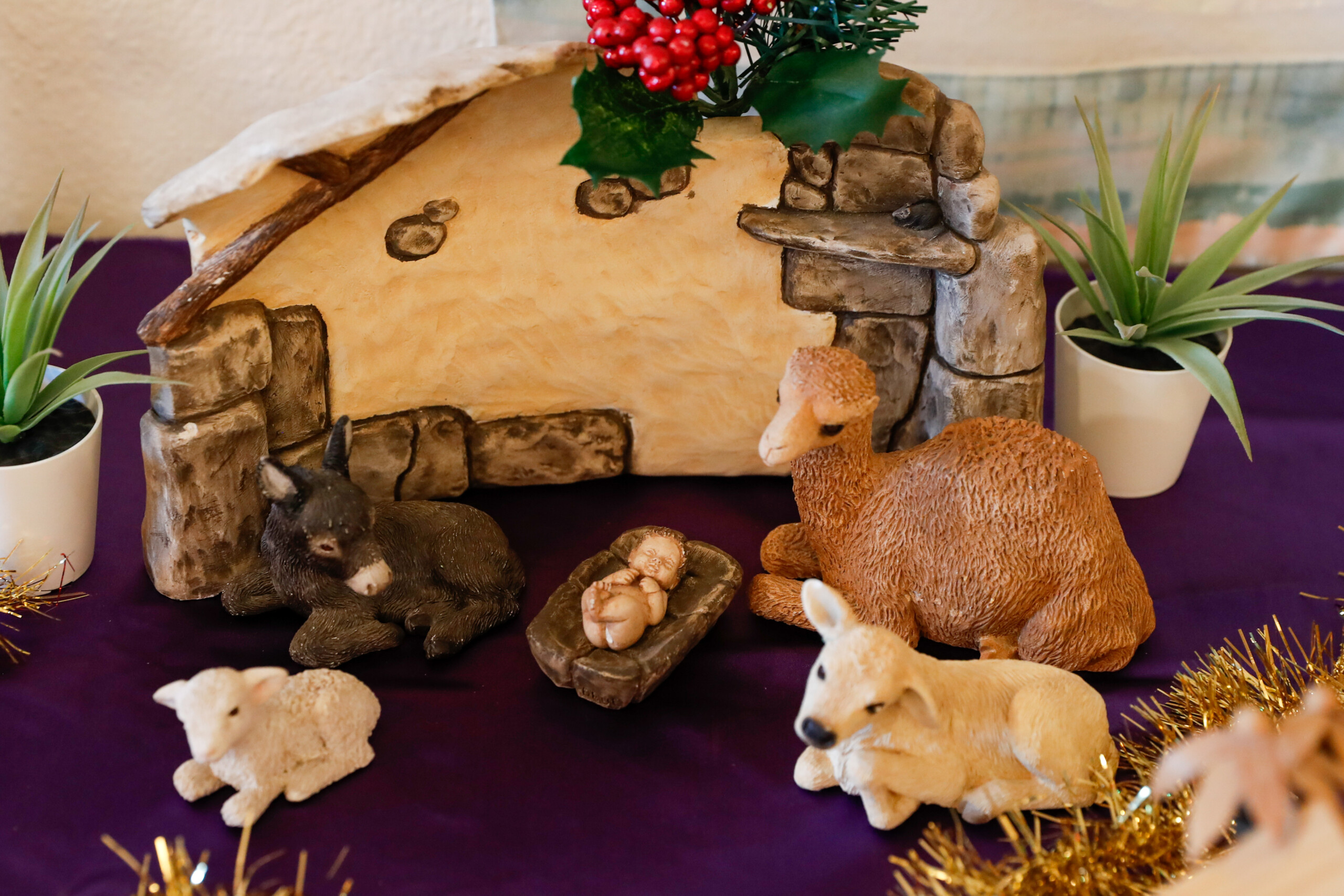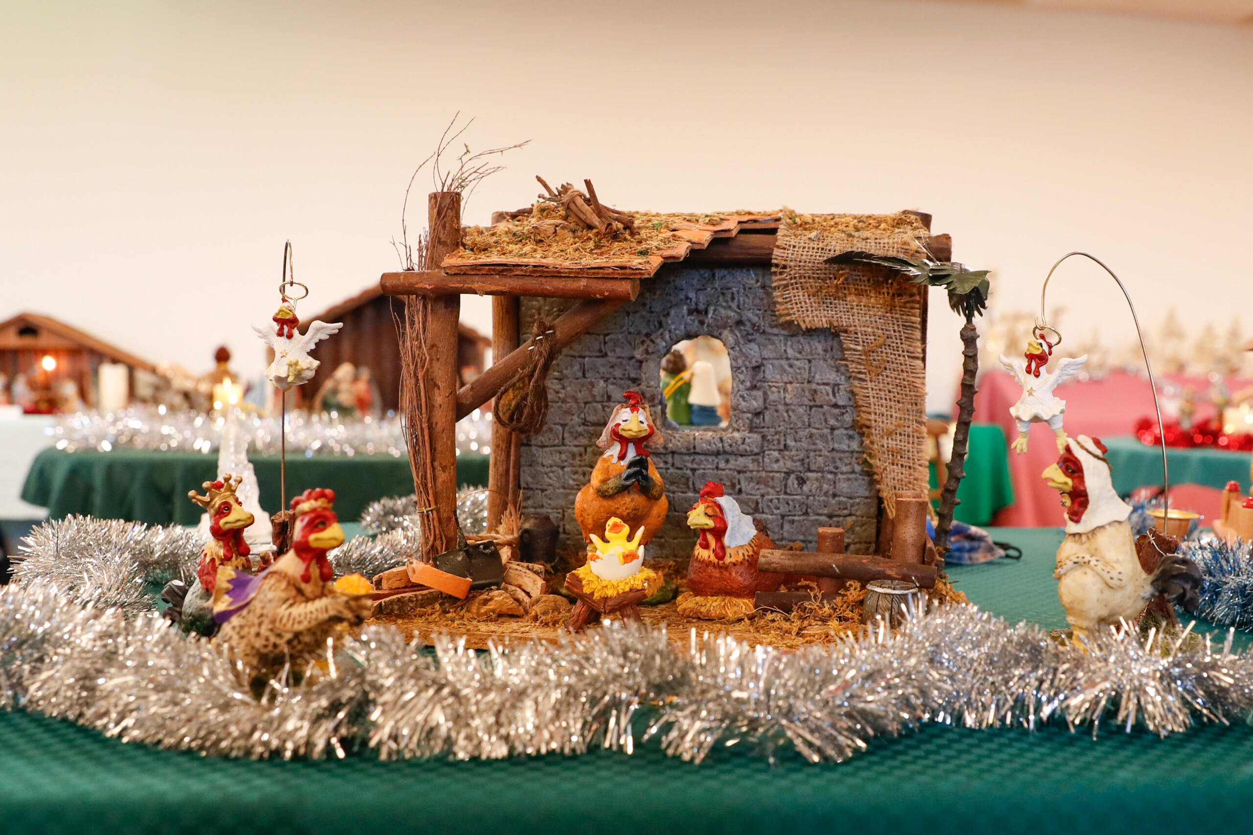 The first Nativity scene done by Rev. Margi Colerick’s mother in 1960. The bodies were made with Duron clay and baked in the family’s home oven. Many details were made from household items including a Wiseman gift from a shotgun shell and a paintbrush for Joseph’s staff. Photo credit Kylie Graham.A closeup of a one of the wise men made by 13-year-old Colerick using Duron clay and fabric. Colerick said she opted not to paint the wise men because she knew her painting skills would leave them looking like clowns. Photo credit Kylie Graham.All Nativity scenes placed on a red tablecloth are available for purchase with a limit of three per customer. The rest of Colerick’s 500-plus collection is available for a free viewing through Sunday. Photo credit Kylie Graham.This is Colerick’s and her daughter Rev. Robin Colerick-Shinkle’s favorite Nativity scene. “Robin and me think this is the best one because it’s very restful and peaceful with no people, just Jesus and the animals. It makes me feel calm and happy,” Margi said. Photo credit Kylie Graham.While she never kept an exact count of her collection, Colerick said that it was, at one point, well over 700. “There’s a little something for everyone here I think,” said Colerick. Photo credit Kylie Graham.A Nativity scene painted by Colerick’s grandaughter, to the left, next to another Nativity scene featuring a “Grumpy Joseph.” Colerick said she was drawn to “Grumpy Joseph” for how it portrays Mary’s husband in a more human way. Photo credit Kylie Graham.After seeing Facebook videos on Dollar Tree crafts, Colerick was inspired to create a more abstract Nativity scene using only what she could find in the store. Photo credit Kylie Graham.The display at Merriam Christian Church is free for all and open from 10 am to 6 pm on Saturday and noon to 6 pm on Sunday. Photo credit Kylie Graham.Scenes placed on red tables are for sale with prices marked down. “I want it to be so that you can buy something you’ll enjoy in your home, I’m not concerned with making money,” Colerick said. Sales benefit Merriam Christian Church’s outreach work in the community. Photo credit Kylie Graham.Many displays in Colerick’s exhibit take a twist on the classic Nativity scene, such as this one featuring chickens. Photo credit Kylie Graham.