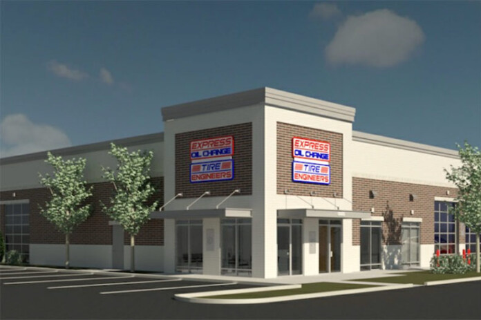 - Renderings depict an L-shaped building with three bay doors for 10-minute oil changes and five for auto care.