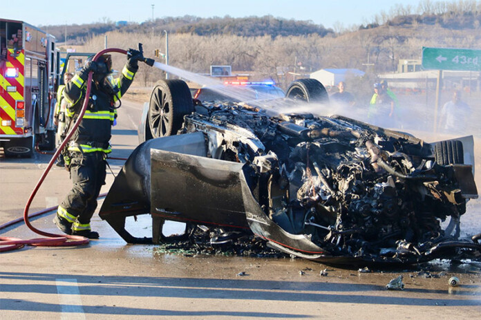 According to the highway patrol’s online crash log, the vehicle crossed into the northbound lanes and hit the bridge barrier wall. The car then rolled onto its roof and caught fire.