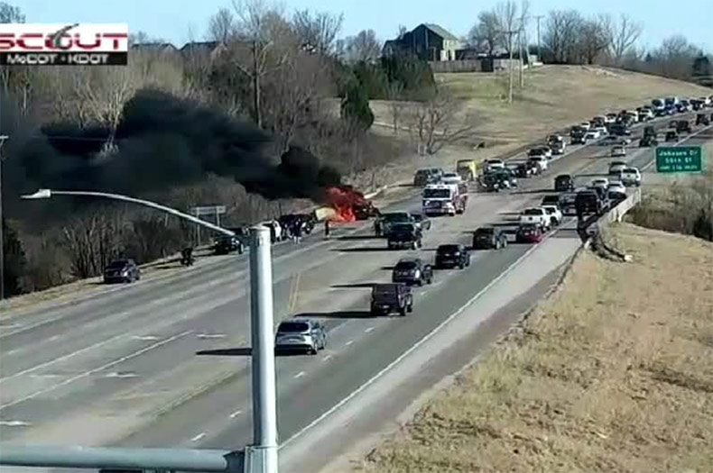Recorded radio traffic stated that several witnesses to the crash stopped and were able to pull the injured driver out of the vehicle before it became engulfed in flames.