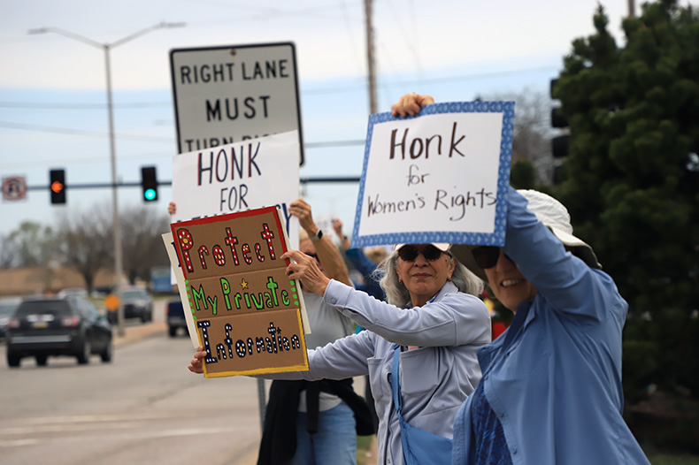 Dozens of women gathered at the busy corner of 95th Street and Quivira Road in Overland Park Thursday, using homemade signs to urge passing motorists to take action on the issues they’re passionate about and to speak up for their democratic rights.