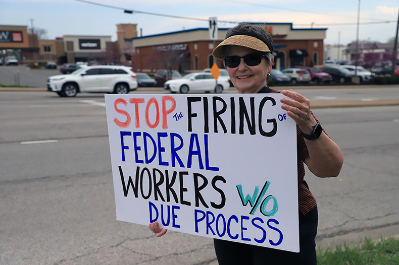 “Stop the firing of federal workers w/o due process,” read a sign held up by Hernandez.