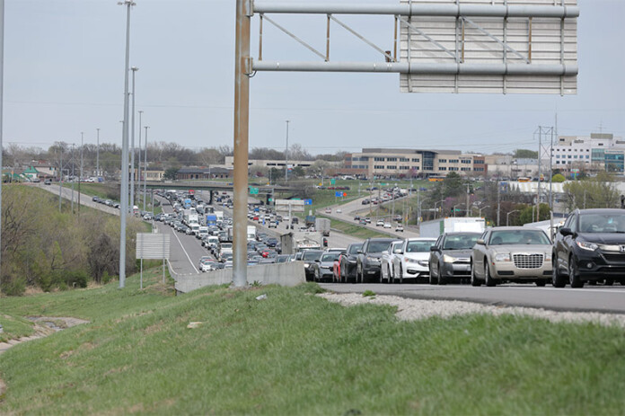 Due to the closure of three southbound lanes at the exit for U.S. 69 Highway, traffic quickly slowed to a crawl and backed up nearly four miles to Antioch Road in Merriam.