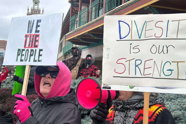 Protesters on the Country Club Plaza in Kansas City, Missouri, on Saturday, April 5. Photo credit Brandon Azim/KCUR.89.3.