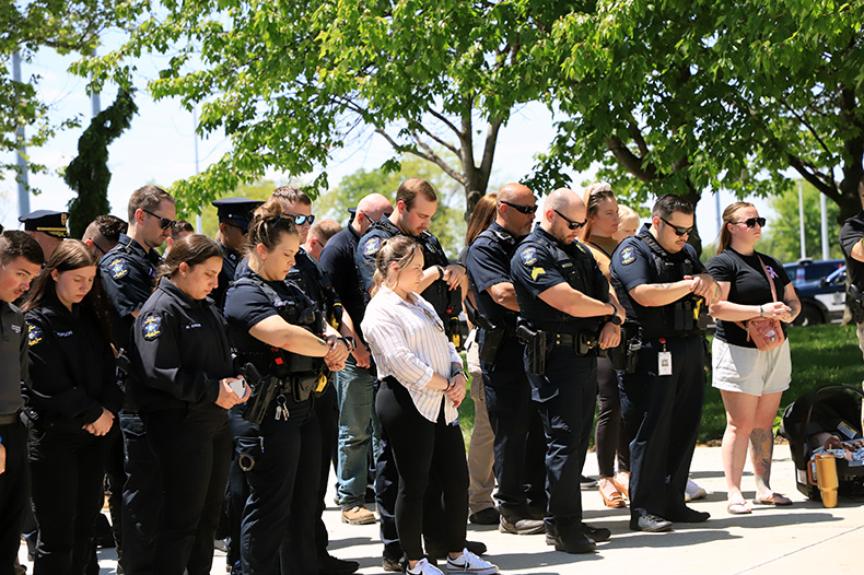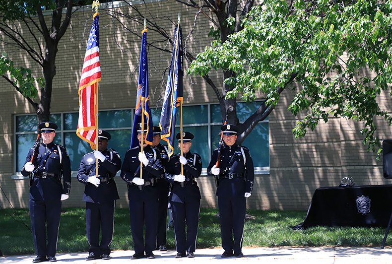 In addition to prepared remarks offered by police department leadership and people who knew Mike Mosher, the police department led a brief commemoration ceremony on Monday marking the end of Mosher’s watch. An honor guard stood watch throughout and a dispatcher read out a final call for Officer Mosher over the radio.
