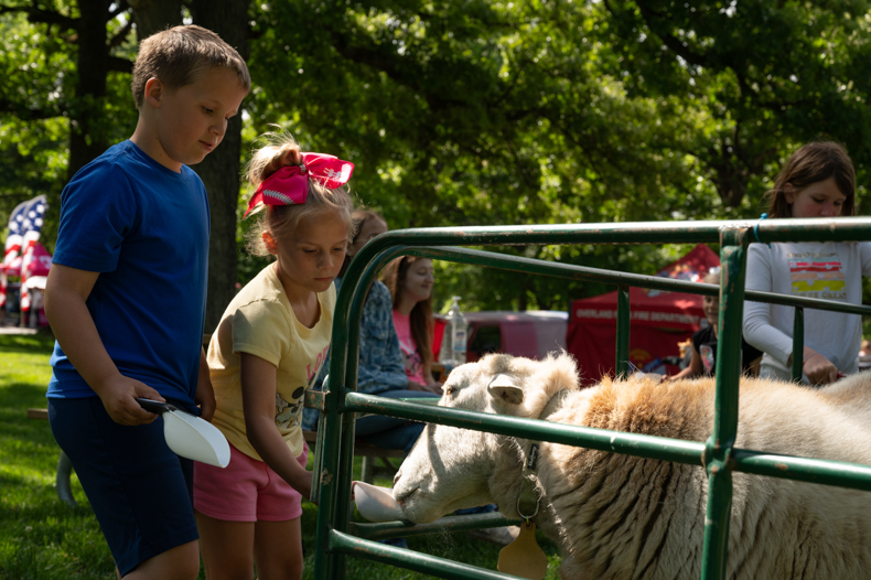 Teagan Lamm receives a tiger balloon from balloon artist Todd Lagessi. Photo credit Julian Schnittker.The musical act Barton Street Band performs for festival-goers. They closed their set with a rendition of “Hey Jude” by The Beatles. Photo credit Julian Schnittker.Ambry, age 8, has a flower painted onto her cheek at Sister Act Entertainment’s face painting booth. Lines for the booth were long, but those who waited left with a smile and a fun design. Photo credit Julian Schnittker.Last year’s reigning pie-eating contest champion in the ages 6-12 division, Ryan Cummins returns for a rematch, but 9-year-old Benny ended up taking the win. Photo credit Julian Schnittker.Ardyn (right), a 3 1/2-year-old, breaks a board at Aplomb Martial Arts’s booth. Representatives from Aplomb hoped to get kids excited about learning martial arts techniques. Photo credit Julian Schnittker.Emma Crawford watches as her father Wes Crawford touches a model T. Rex’s sharp teeth. Dinosaur Take Over used large and small props to engage kids in hands-on learning about dinosaurs. Photo credit Julian Schnittker.Six-year-old Lincoln and 9-year-old Savannah take turns feeding a sheep at the petting zoo. The petting zoo also housed a donkey and two small goats. Photo credit Julian Schnittker.Melissa Schumann helps Amelia Swanger and Beckett Schumann fish with the rods and bait provided by local organization Cops n’ Bobbers. Cops n’ Bobbers offers educational events and tournaments for youth in Johnson County to improve their fishing skills. Photo credit Julian Schnittker.Milo takes a turn in the drum circle provided by local musical educational group Drum Safari. His father, EJ, said that the festival helped them discover just how much Milo likes music and dancing and that they plan on buying him a drum to play at home. Photo credit Julian Schnittker.Food vendors offer both savory meals and sweet treats to keep attendees refreshed on a summer day. Photo credit Julian Schnittker.The Bubbleologist Party draws large crowds eager to chase and pop soapy bubbles. Photo credit Julian Schnittker.