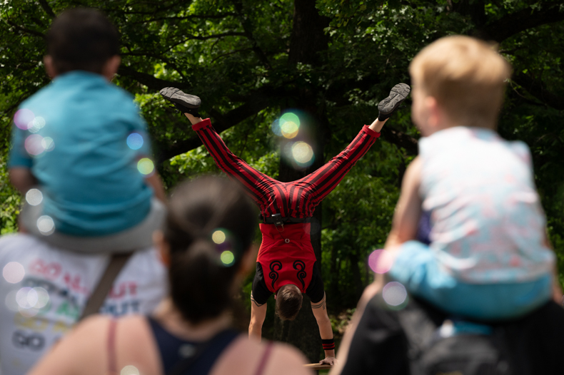 Evelyn (right) plays a round of whack-a-mole with a little help from her father. Many fair events were sponsored by local companies and organizations. The whack-a-mole game was sponsored by Renewal by Anderson. Photo credit Julian Schnittker.Jason D’Vaude performs his circus act for a captive audience as bubbles drift in from nearby. Photo credit Julian Schnittker.