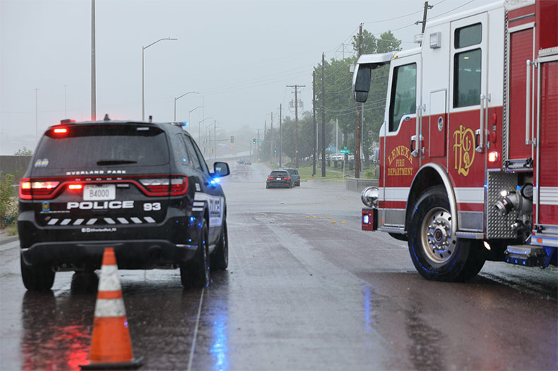 Real Time Information Center. Two SUVs stranded in high water on E. Frontage Road near Mastin Street, with Lenexa Fire and Overland Park Police units blocking the road. The occupants of both vehicles had already been helped from the water when this photograph was taken. Photo credit Mike Frizzell.