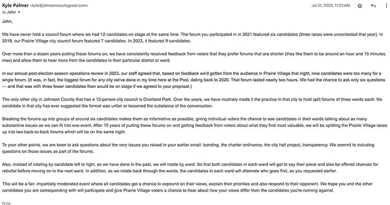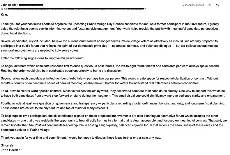 Beeder himself ran unsuccessfully for a Prairie Village City Council seat in 2021 and participated in the Post’s forum that year. In his initial email to me, he said he “greatly valued the role these events play in informing voters and fostering civic engagement.”
