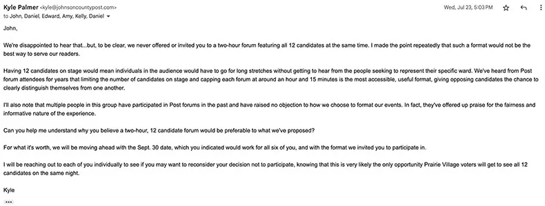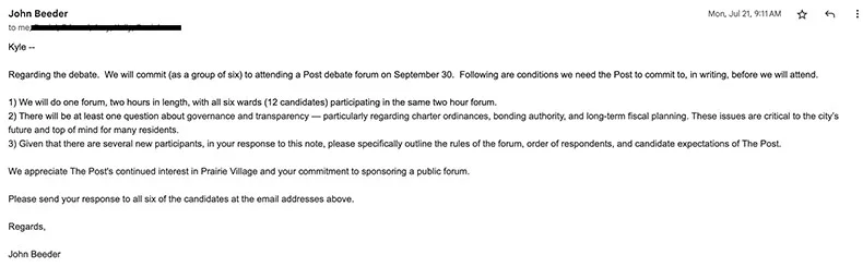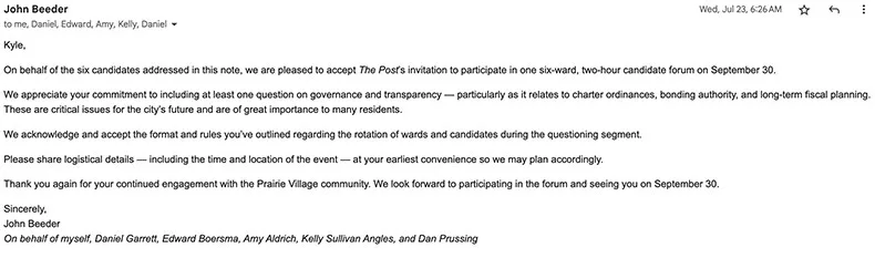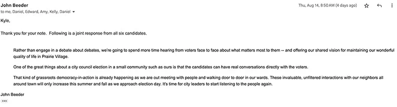 I first heard from the six Prairie Village candidates in question on July 14, in an email sent from Ward 5 candidate John Beeder, who would serve as the group’s de facto spokesperson for the remainder of the back-and-forth.