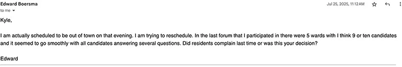 Boersma, like Beeder, has participated in a Post event before, in 2023 when he ran as a write-in candidate for Prairie Village City Council. I pointed that out in my email to him.