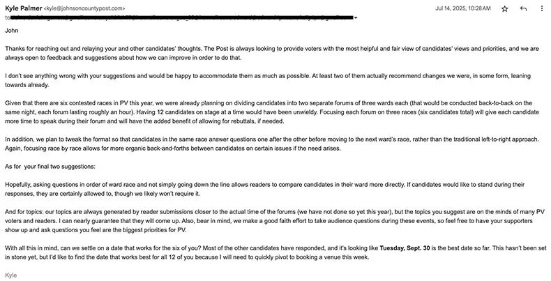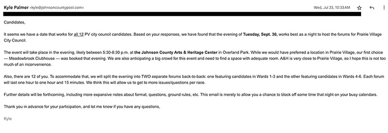 I sent out an initial email to all 12 Prairie Village City Council candidates on July 8, listing four possible dates for a forum in that city and asking the candidates to get back to me with the dates that worked best for them.