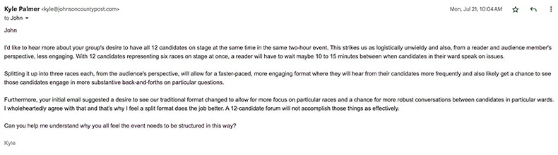 “Having 12 candidates on stage at a time would have been unwieldy,” I wrote to the candidates on July 14. “Focusing each forum on three races (six candidates total) will give each candidate more time to speak during their forum and will have the added benefit of allowing for rebuttals, if needed.”
