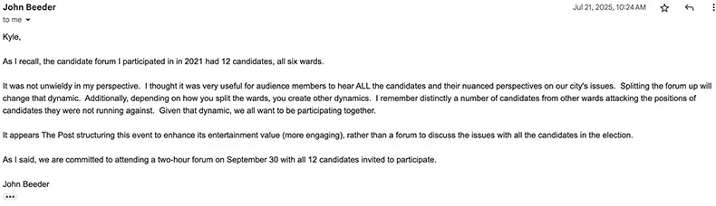 Later that same day, Beeder responded rescinding the group’s earlier acceptance of the Post’s invitation to participate in the Sept. 30 forum, again citing the group’s desire to have all 12 candidates on stage at once as the reason they would not participate.