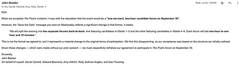 Two days later on July 23, Beeder sent an email on behalf of the group formally accepting the Post’s invitation to participate in a forum on Sept. 30.