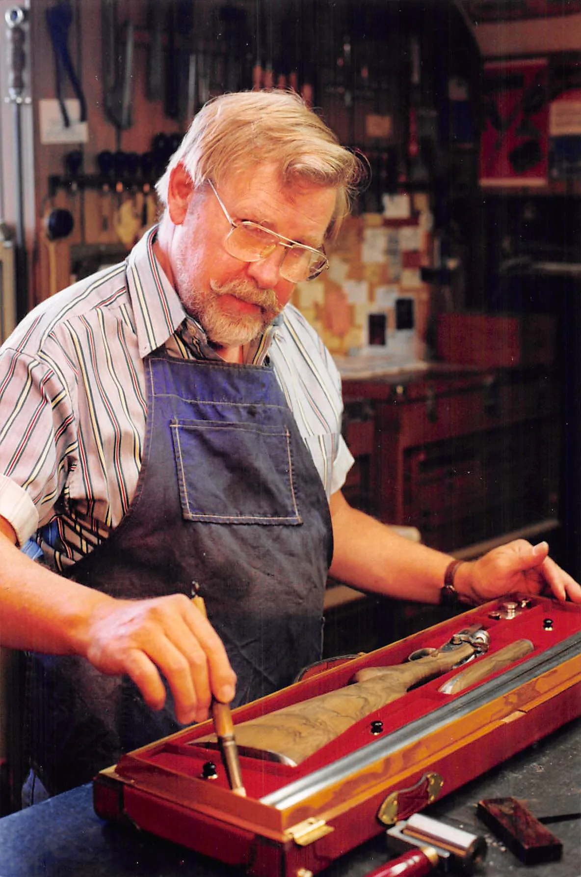 Following his service, Marvin worked briefly at Commerce Bank before discovering his true calling as a gifted stained glass artisan. Beginning as a solo craftsman, he created stained glass windows and fixtures for homes and businesses. His success allowed him to open a studio that became both a thriving business and a school, where he generously trained others in the art. Later, he embarked on a second career designing and fabricating world-class custom oak-and-leather cases for vintage firearms, antiques, wine, astronomical instruments, and other collectibles, attracting clients from around the globe.