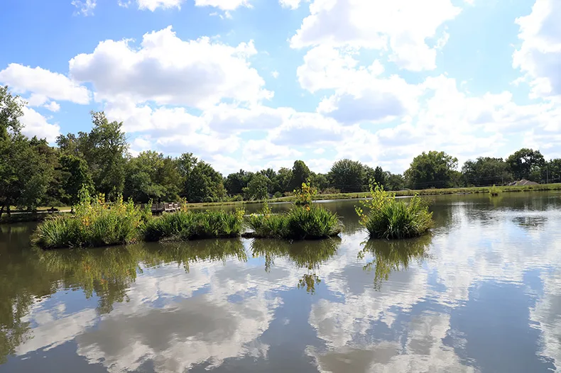 In 2023, Overland Park added 10 additional floating wetlands to South Lake Park’s body of water, all 100 square feet apiece with about 100 plants each, and started looking at other lakes in the city that might benefit from their own floating wetlands.