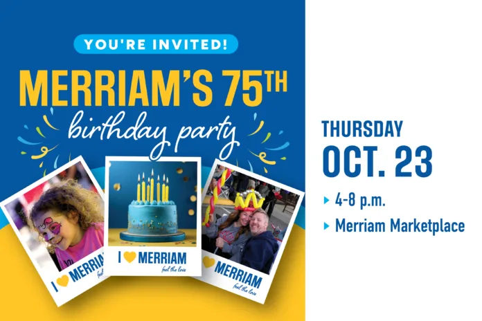 Merriam is turning 75, and the city is inviting the entire community to join the celebration. The free, family-friendly Merriam 75th Birthday Party will take place Thursday, Oct. 23, from 4–8 p.m. at Merriam Marketplace (5740 Merriam Dr.).