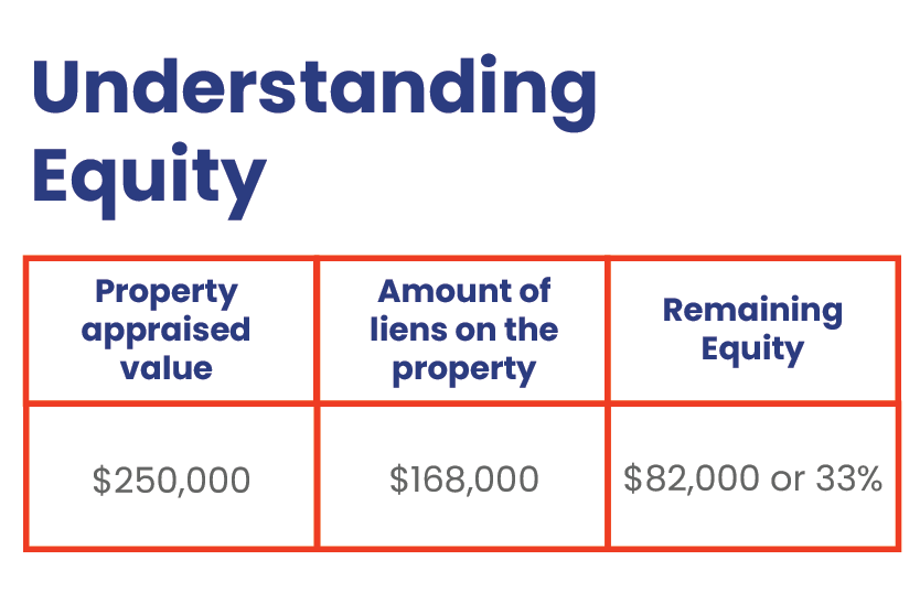 Let’s start at the beginning. What is equity? Equity is the amount equal to the difference between the home’s value and the liens held against it. It’s expressed as both a dollar amount and a percentage.