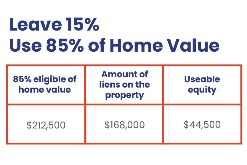 In this example, let’s allow for 15 percent equity to remain; a total of 85 percent of the home’s value is eligible to be financed. Usable equity would be the amount available after factoring in existing lien amount(s). See below where we use the above house’s value as an example.